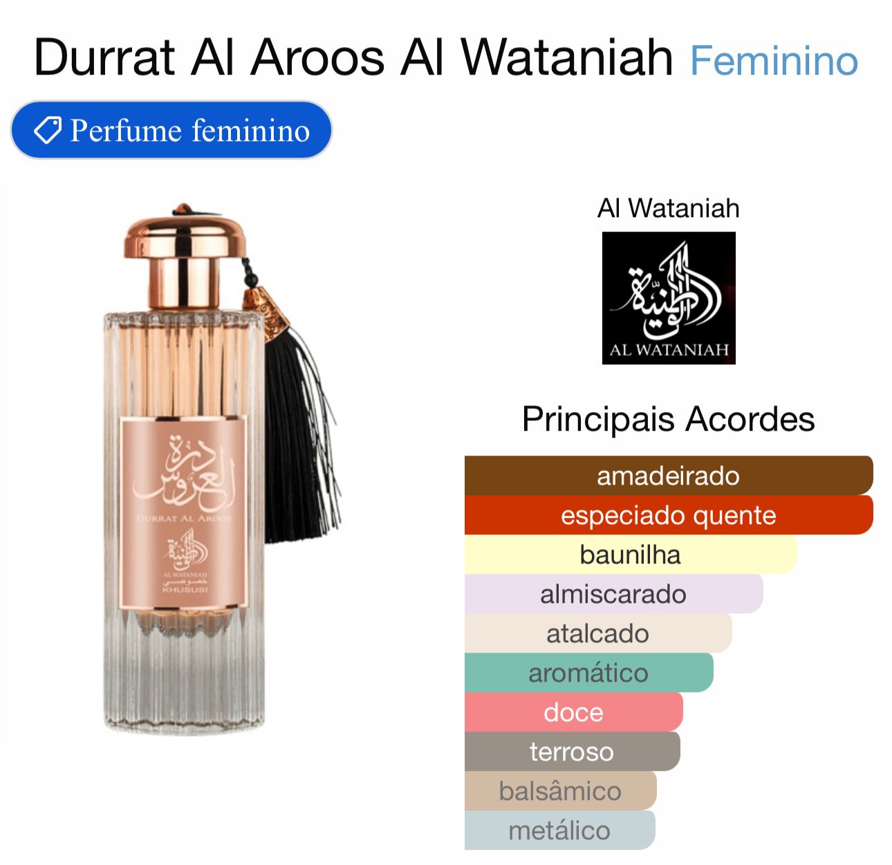Durrat Al Aroos de Al Wataniah é um perfume Oriental Feminino. Esta é uma nova fragrância. Durrat Al Aroos foi lançada em 2022. As notas de topo são: Almíscar Branco e Nagarmota ou Óleo de Cipriol. As notas de coração são: Baunilha, Açafrão e Cardamomo. As notas de fundo são: Madeira Guaiac e Cumarina.