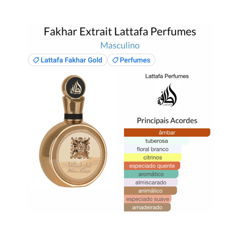 Fakhar Extrait de Lattafa Perfumes é um perfume Feminino. Esta é uma nova fragrância. Fakhar Extrait foi lançada em 2023. As notas de topo são: Toranja, Pimenta Rosa e Cardamomo. As notas de coração são: Tuberosa, Notas Solares e Artemísia. As notas de fundo são: Ládano, Âmbar, Cashmeran e Couro.
