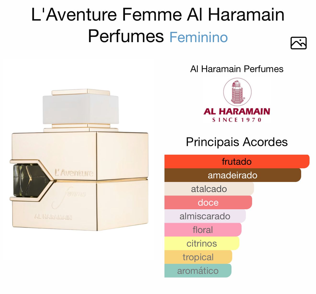 L’Aventure Femme de Al Haramain Perfumes é um perfume Floral Frutado Feminino. L’Aventure Femme foi lançada em 2017. As notas de topo são: Abacaxi, Groselha Preta, Bergamota e Frutos Silvestres. As notas de coração são: Cedro, Frésia e Rosa. As notas de fundo são: Almíscar, Sândalo, Âmbar e Baunilha.