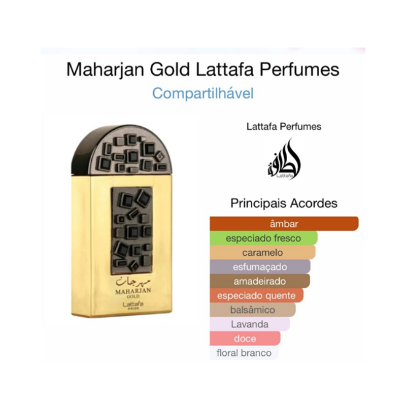 Maharjan Gold de Lattafa Perfumes é um perfume Compartilhável. Esta é uma nova fragrância. Maharjan Gold foi lançada em 2022. As notas de topo são: Pimenta e Lavanda. As notas de coração são: Incenso, Tuberosa e Jasmim. As notas de fundo são: Caramelo, Cedro, Âmbar e Cashmeran.