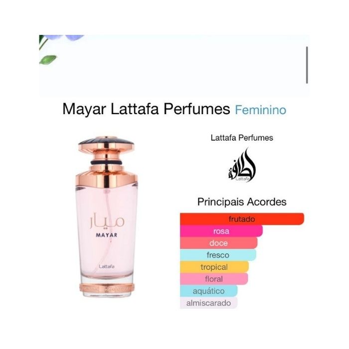 Mayar de Lattafa Perfumes é um perfume Floral Frutado Feminino. Esta é uma nova fragrância. Mayar foi lançada em 2022. As notas de topo são: Lichia, Framboesa e Folha de Violeta. As notas de coração são: Peônia, Rosa Branca e Jasmim. As notas de fundo são: Baunilha e Almíscar.