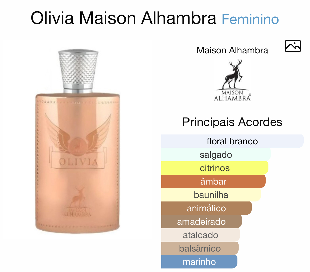Olivia de Maison Alhambra é um perfume Floral Amadeirado Almiscarado Feminino. Esta é uma nova fragrância. Olivia foi lançada em 2023. As notas de topo são: Jasmim, Mandarina, Gengibre e Lírio. As notas de coração são: Sal e Baunilha. As notas de fundo são: Âmbar Cinzento e Sândalo.