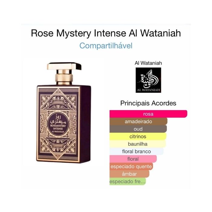 Rose Mystery Intense de Al Wataniah é um perfume Floral Compartilhável. Esta é uma nova fragrância. Rose Mystery Intense foi lançada em 2023. As notas de topo são: Mandarina e Bergamota Siciliana. As notas de coração são: Rosa Búlgara, Rosa Turca, Óleo de Rosa, Jasmim Egípcio e Jasmim Sambac. As notas de fundo são: Georgywood, Akigalawood, Baunilha de Madagascar, Ambrofix™ e Olíbano.