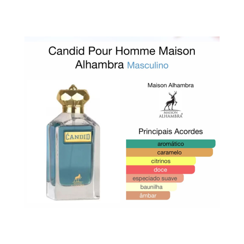 Candid Pour Homme de Maison Alhambra é um perfume Oriental Fougére Masculino. Esta é uma nova fragrância. Candid Pour Homme foi lançada em 2024. As notas de topo são: Sálvia Esclaréia e Mandarina. As notas de coração são: Caramelo e Fava Tonka. A nota de fundo é Vetiver.  Candid Pour Homme de Maison Alhambra é um perfume Oriental Fougére Masculino. Esta é uma nova fragrância. Candid Pour Homme foi lançada em 2024. As notas de topo são: Sálvia Esclaréia e Mandarina. As notas de coração são: Caramelo e Fava Tonka. A nota de fundo é Vetiver.