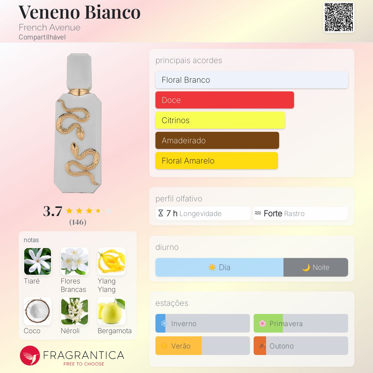 Veneno Bianco de French Avenue é um perfume Floral Compartilhável. Esta é uma nova fragrância. Veneno Bianco foi lançada em 2025. As notas de topo são: Néroli, Bergamota e Leite. As notas de coração são: Tiaré, Flores Brancas e Ylang Ylang. As notas de fundo são: Coco, Baunilha, Madeira Guaiac e Ládano.
