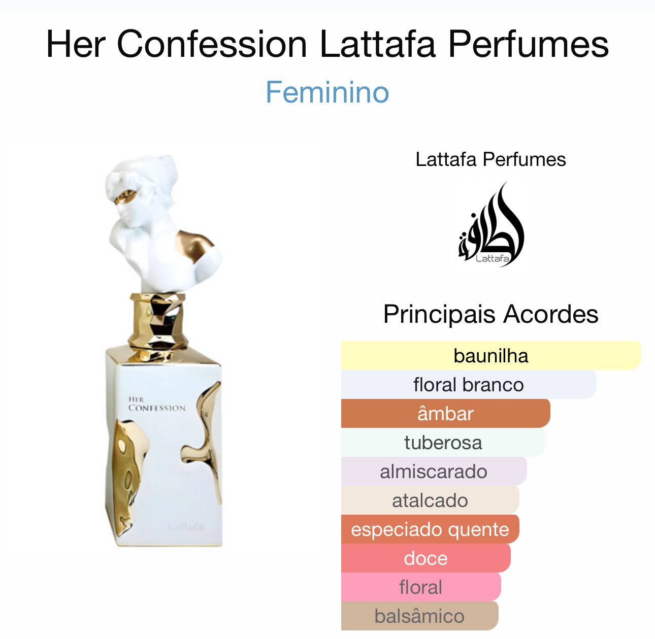 Her Confession de Lattafa Perfumes é um perfume Feminino. Esta é uma nova fragrância. Her Confession foi lançada em 2024. As notas de topo são: Mystikal e Canela. As notas de coração são: Tuberosa, Jasmim, Incenso e Mahonial®. As notas de fundo são: Baunilha, Fava Tonka e Almíscar.