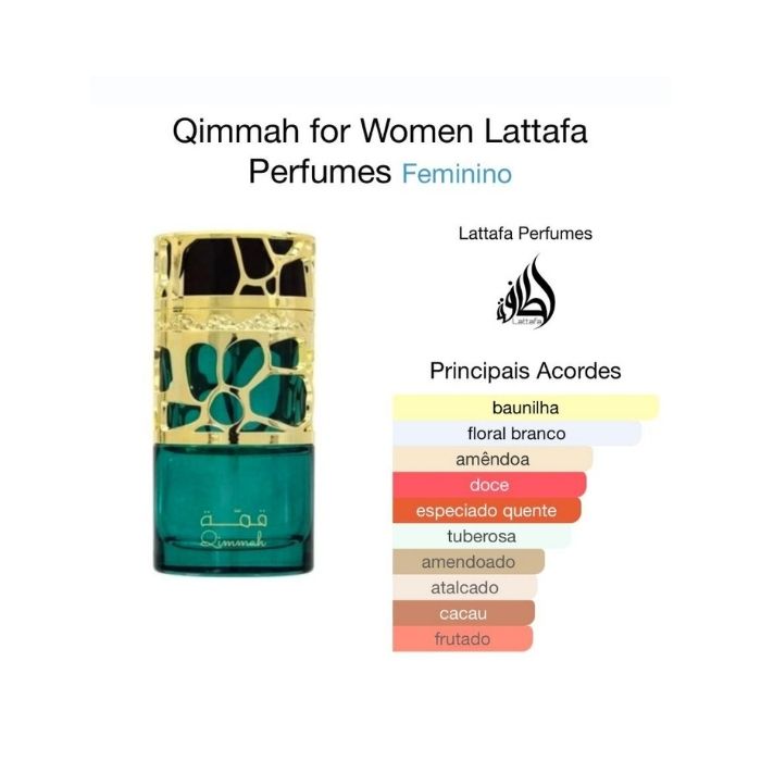 Qimmah for Women de Lattafa Perfumes é um perfume Feminino. Esta é uma nova fragrância. Qimmah for Women foi lançada em 2022. As notas de topo são: Amêndoa e Café. As notas de coração são: Tuberosa, Jasmim e Fava Tonka. As notas de fundo são: Baunilha, Cacau e Sândalo.