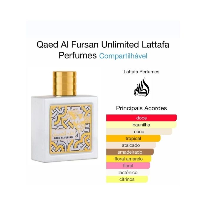 Qaed Al Fursan Unlimited de Lattafa Perfumes é um perfume Compartilhável. Esta é uma nova fragrância. Qaed Al Fursan Unlimited foi lançada em 2022. As notas de topo são: Coco, Cítricos e Abacaxi. As notas de coração são: Ylang Ylang, Jasmim-Manga e Jasmim. As notas de fundo são: Baunilha, Almíscar, Sândalo e Notas Doces.