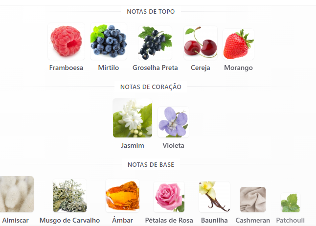 Notas de base: Baunilha, musk branco, âmbar quente