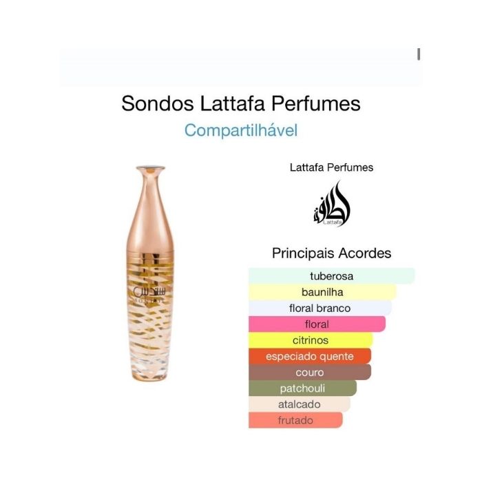 Sondos de Lattafa Perfumes é um perfume Compartilhável. Esta é uma nova fragrância. Sondos foi lançada em 2023. O perfumista que assina esta fragrância é Alex Lee. As notas de topo são: Mandarina e Açafrão. As notas de coração são: Tuberosa, Flor de Pêssego e Rosa. As notas de fundo são: Baunilha, Camurça e Patchouli.
