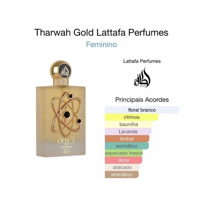 Tharwah Gold de Lattafa Perfumes é um perfume Âmbar Floral Feminino. Esta é uma nova fragrância. Tharwah Gold foi lançada em 2022. As notas de topo são: Lavanda e Bergamota. As notas de coração são: Flor de Laranjeira e Jasmim Egípcio. As notas de fundo são: Baunilha, Âmbar e Vetiver.